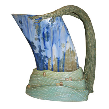 Beautiful warm green cup with a saucer presenting a village with iconic miniature houses by the lake.