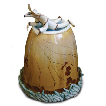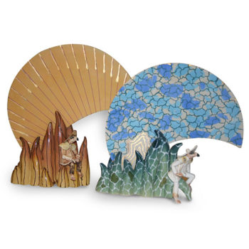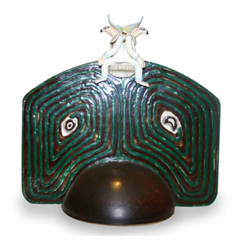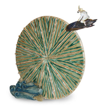 Large sculpture of Horuda, a mythical inspired creature, pushing a large ring. Horuda takes on features from Western and Eastern worlds. He is a combination of Greek Horus and Indian Garuda.