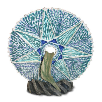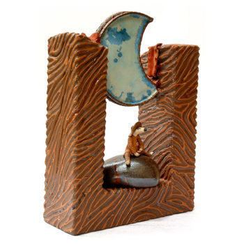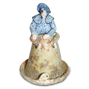 Medium sized sculpture with Horuda, the author’s ‘Trade Mark’ character that appears on many artifacts. Horuda is standing on a hill glazed with a light milky crystalling glaze.